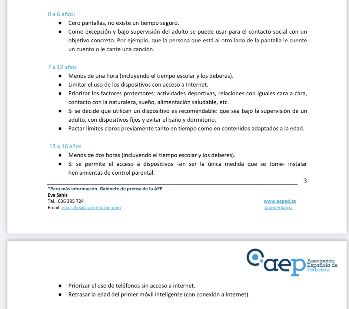 Os dejo las recomendaciones de la Asociación Española de pediatría respecto al uso de pantallas, basadas en evidencia científica: